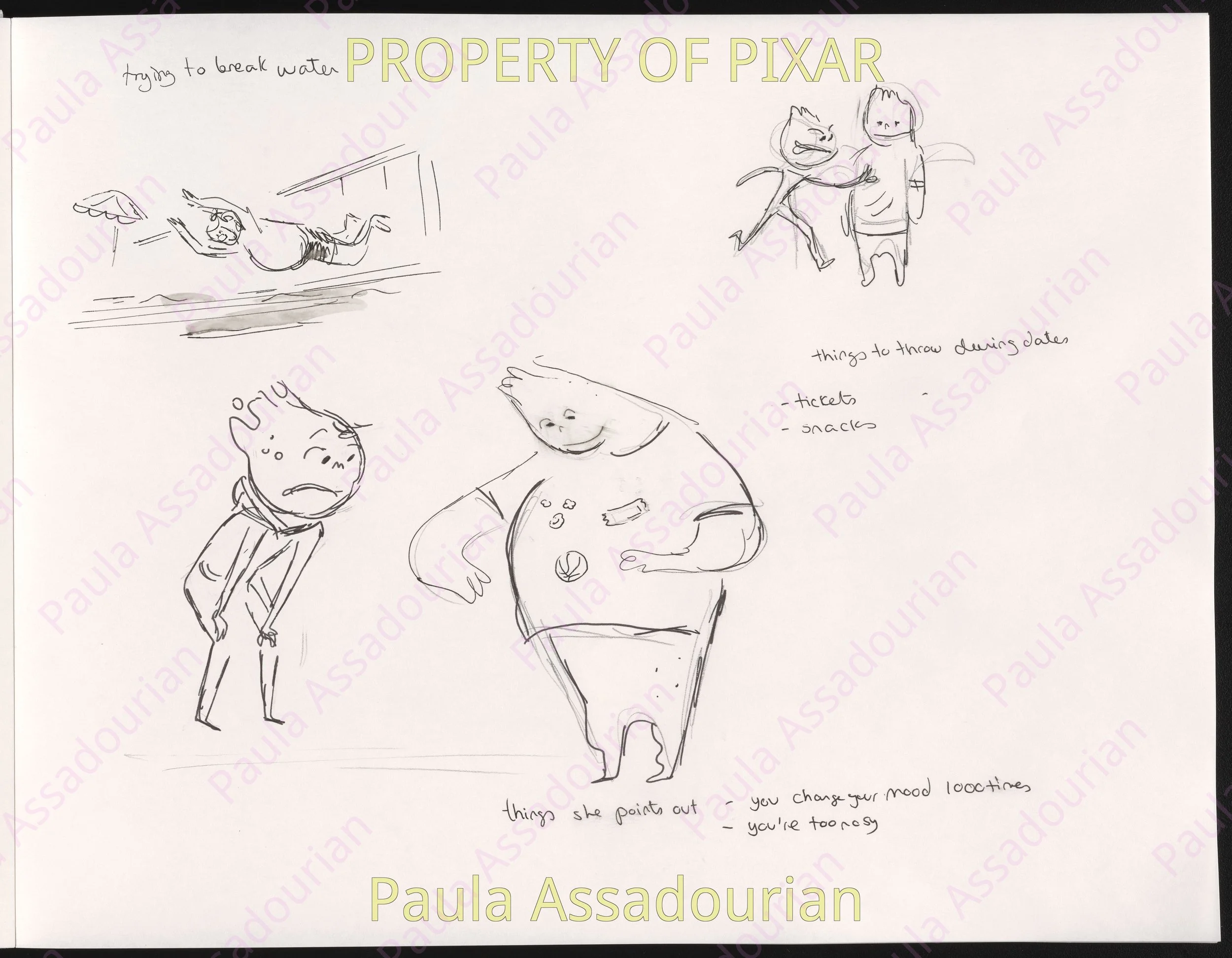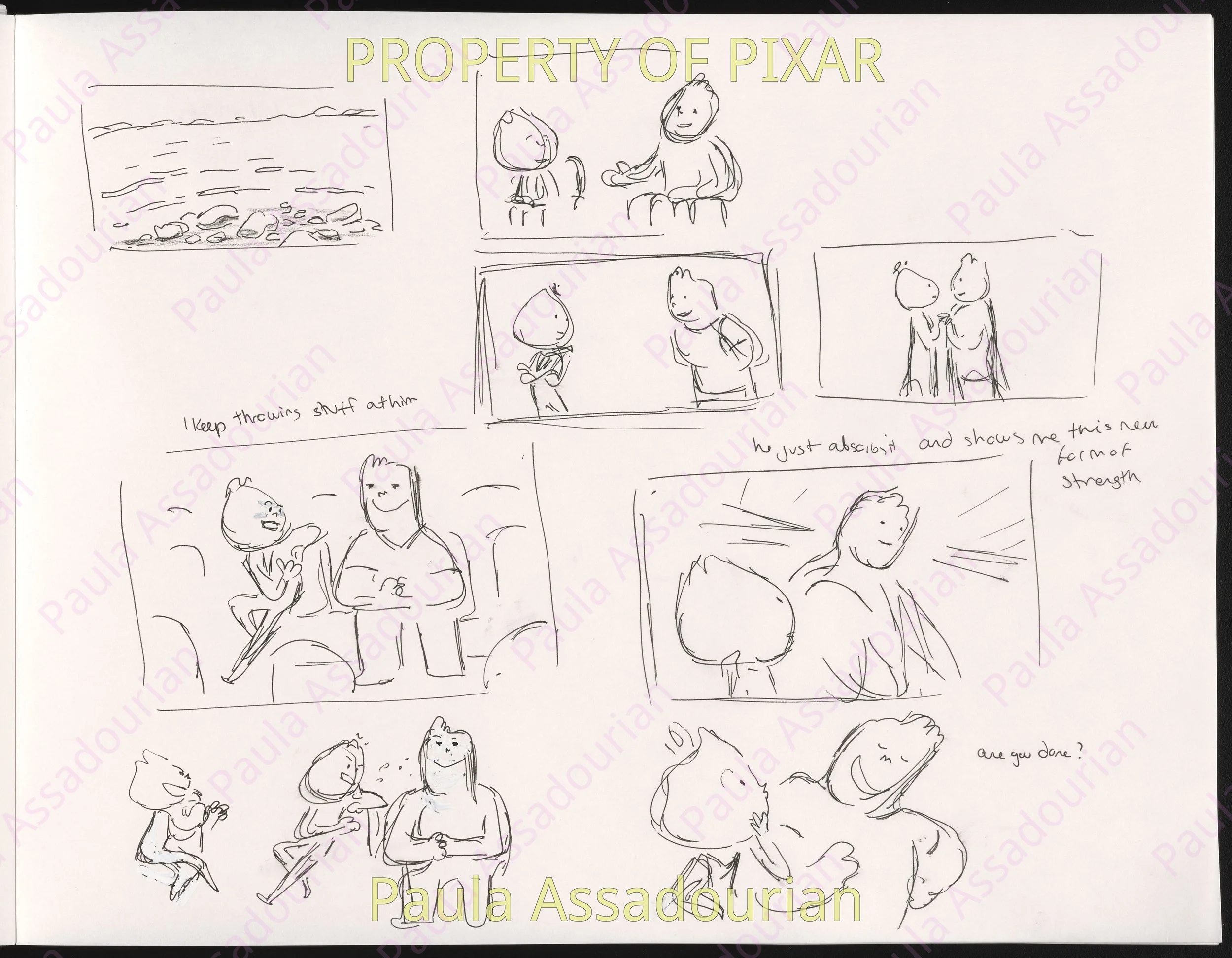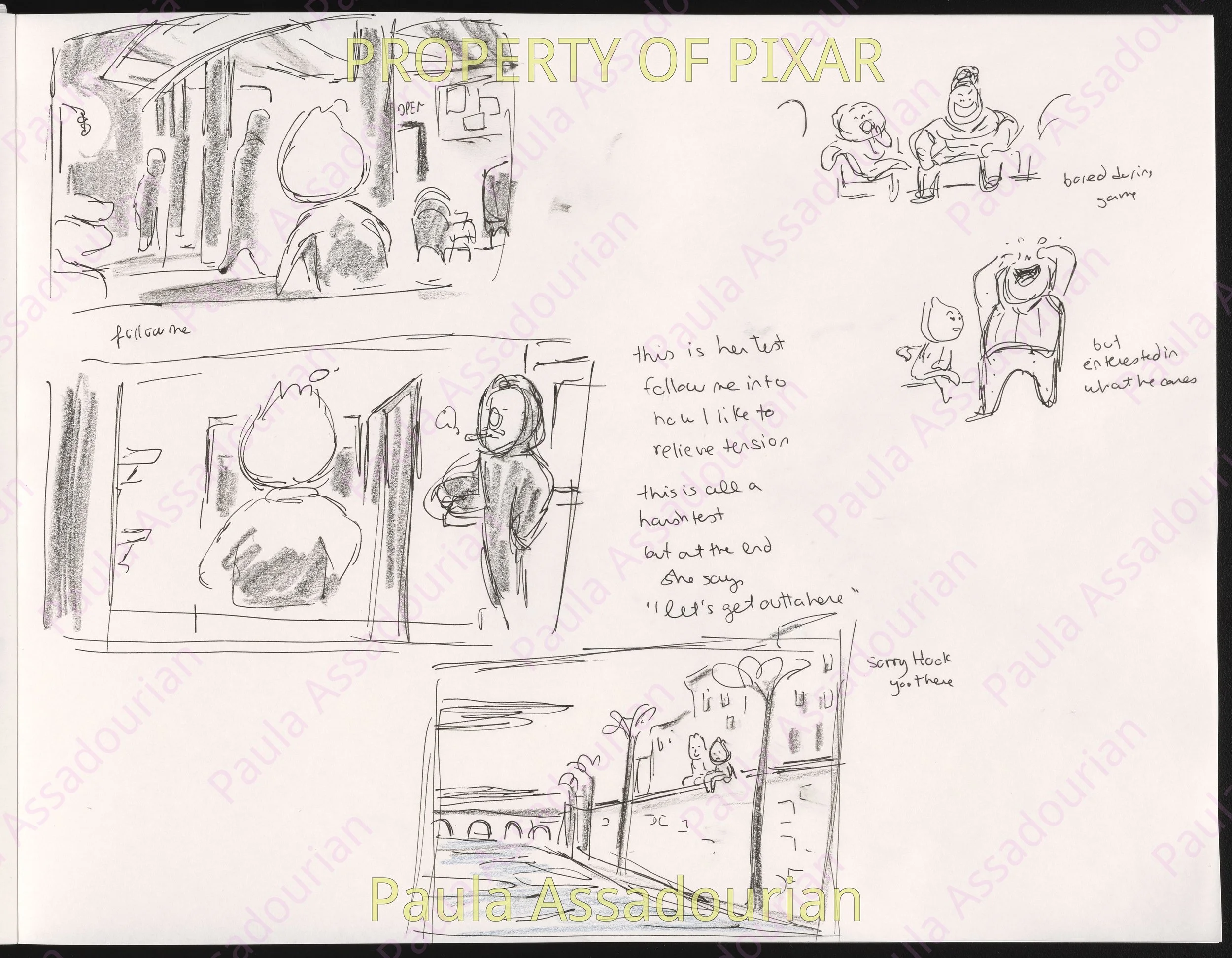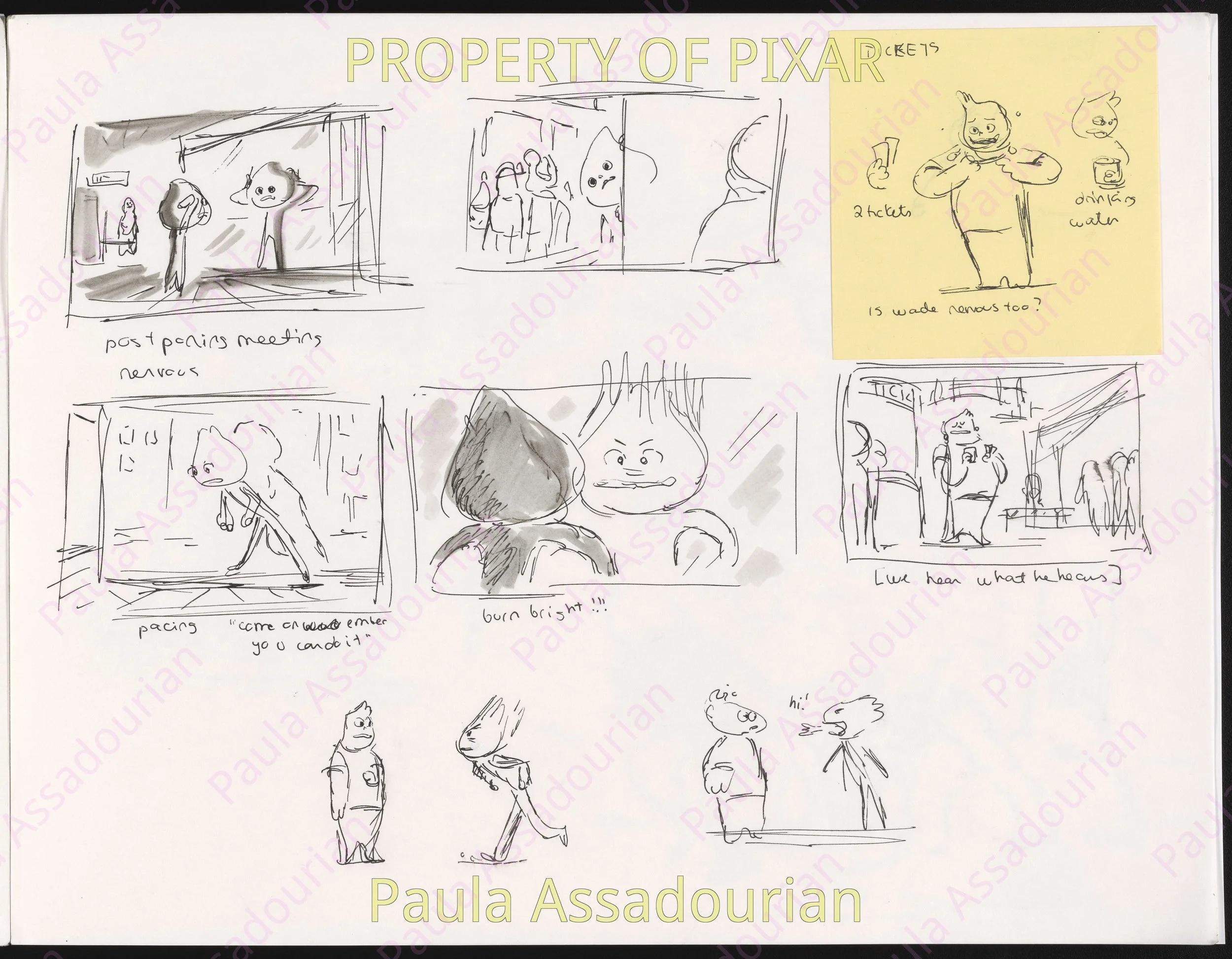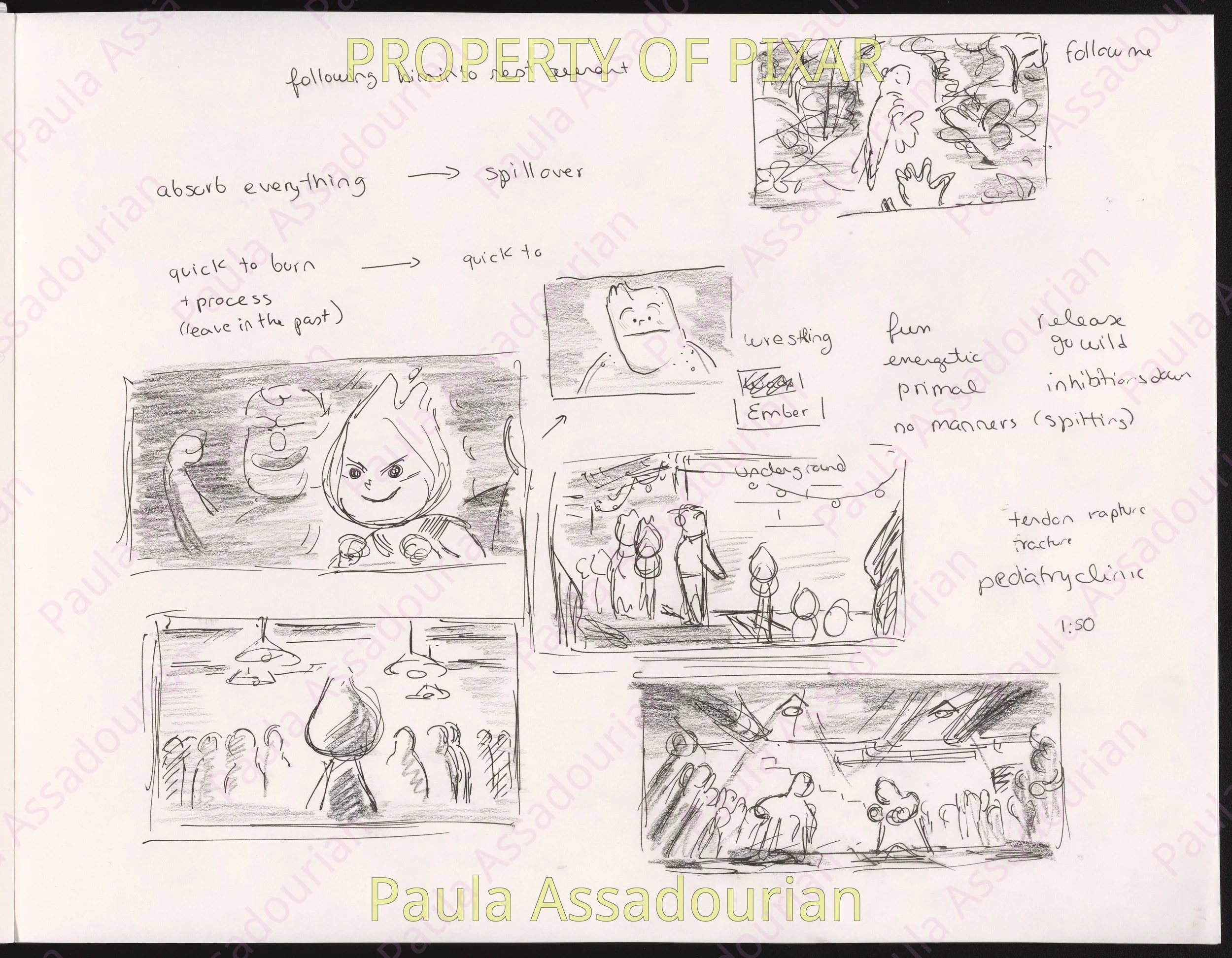 Thumbnails imagining what Wade and Ember’s first three dates would be. A lot of great ideas that made it into the movie are here: cheering for Lutz, the grittiness of the mud fight, and the private scene where Ember recognizes herself as being in love. Really proud of this work and how it helped shape the final film! (Click on the images to expand.)