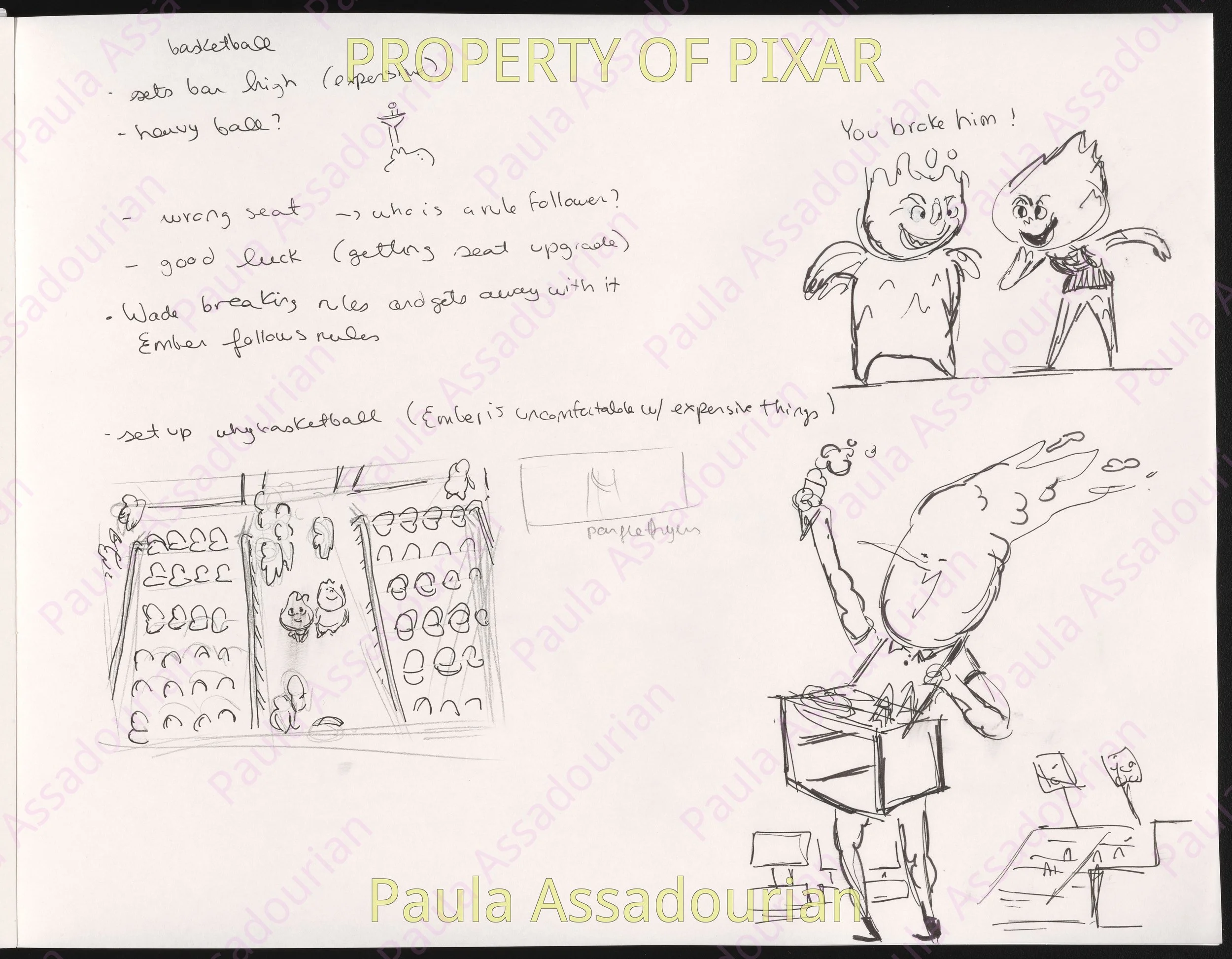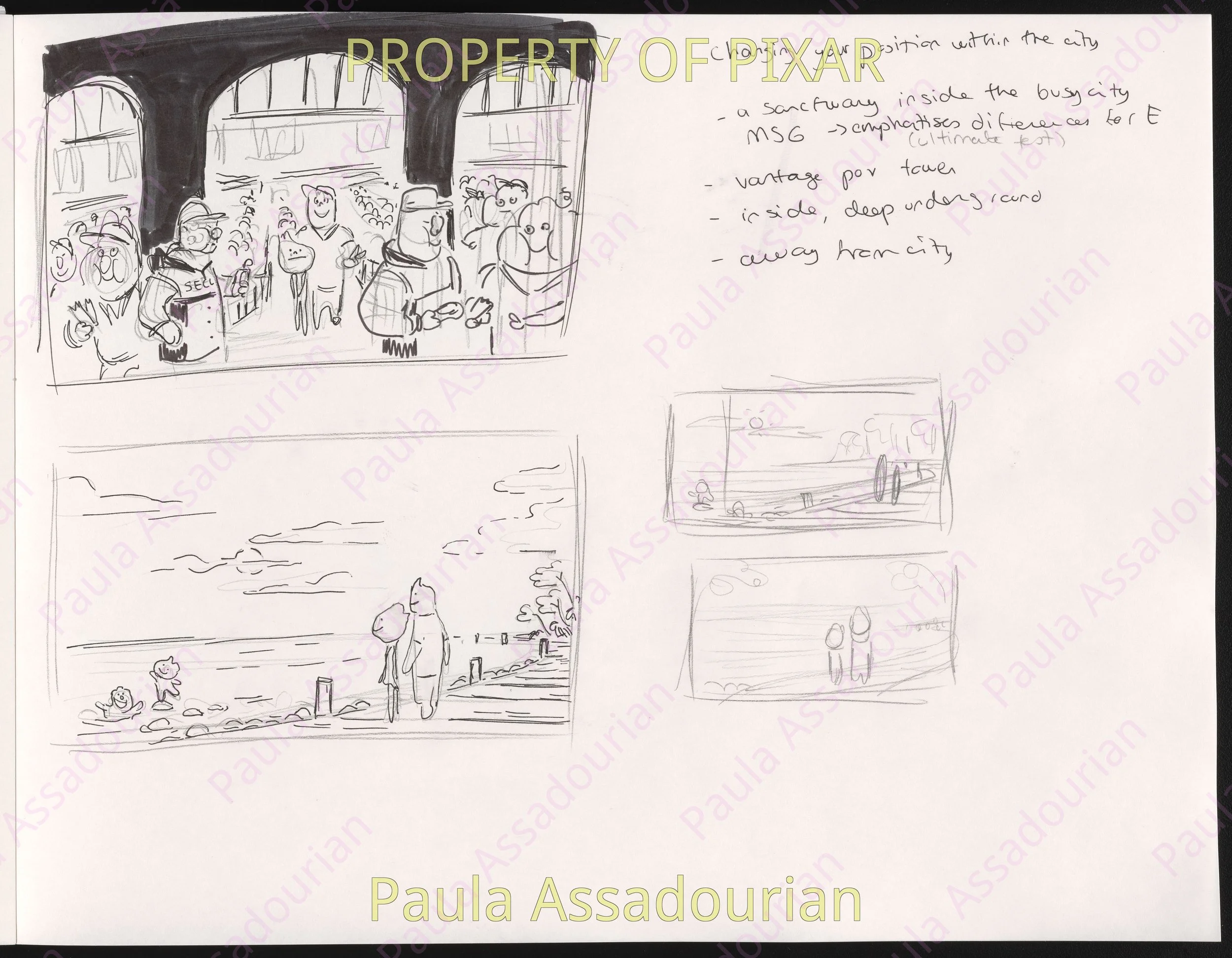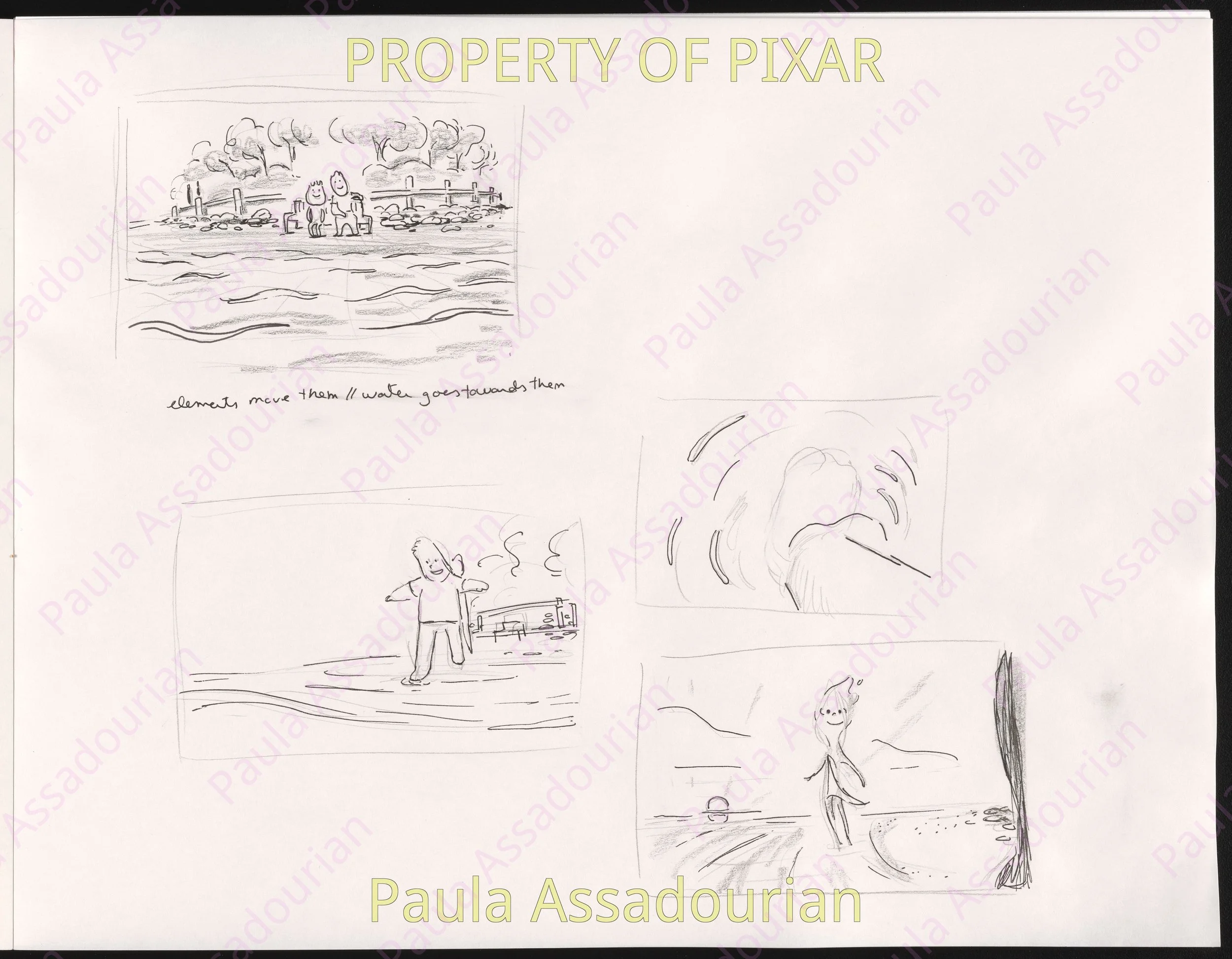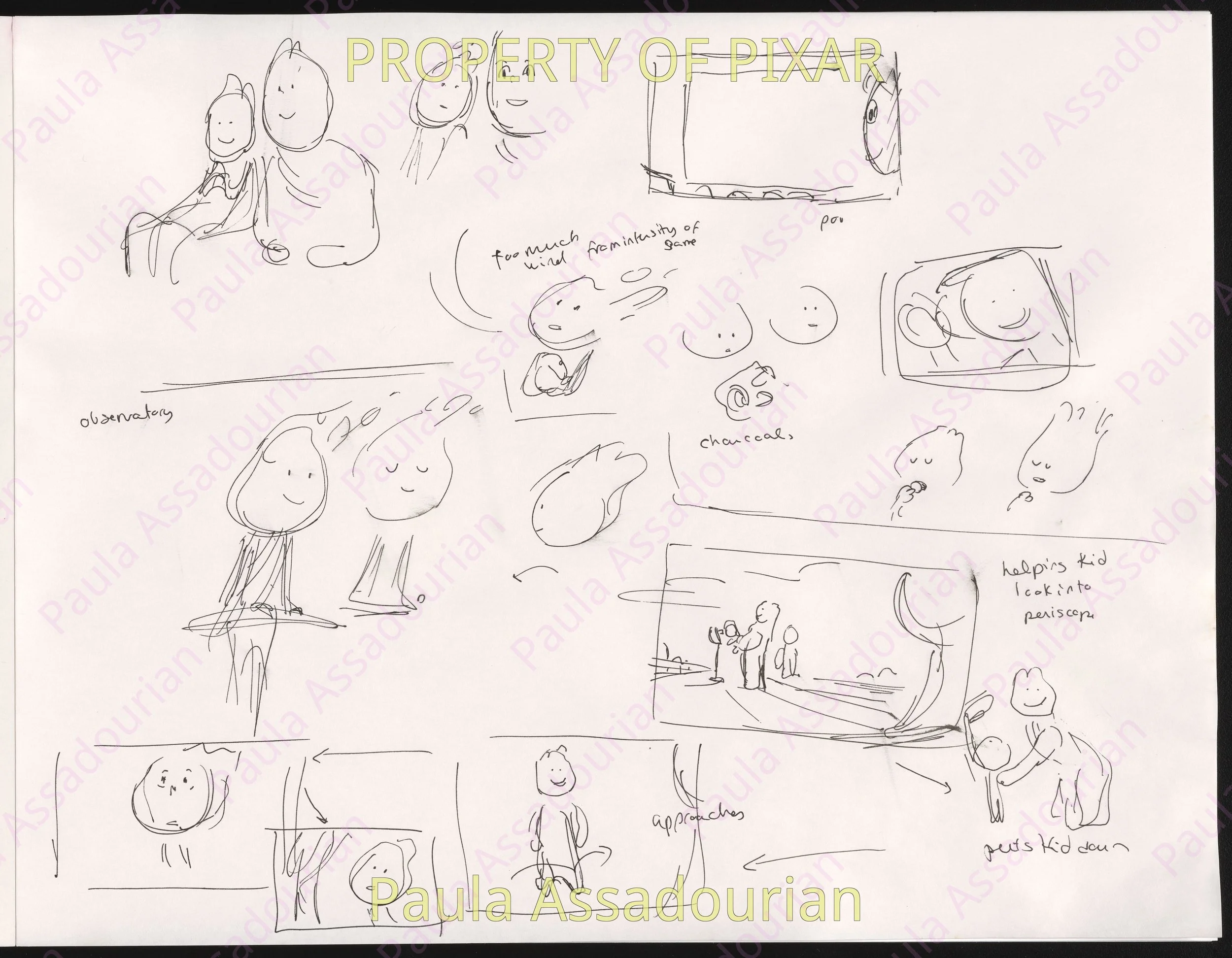 Thumbnails imagining what Wade and Ember’s first three dates would be. A lot of great ideas that made it into the movie are here: cheering for Lutz, the grittiness of the mud fight, and the private scene where Ember recognizes herself as being in love. Really proud of this work and how it helped shape the final film! (Click on the images to expand.)